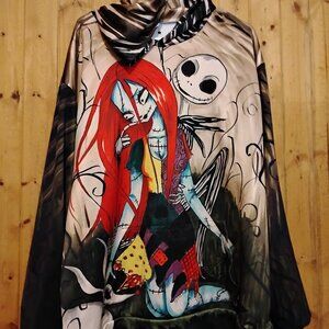 A men's all over print Nightmare Before Christmas hoodie featuring Jack Skellington and the Corpse Bride. Hoodie has no size tag but fits about an XXL or a little bigger. Made of a nylon type material. Hoodie has been worn but is still in very good condition.