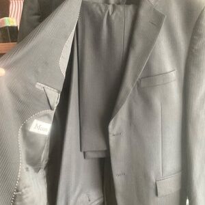 Selling this men’s black suit. It has subtle stripes on it. It is not dry cleaned. Was worn a handful of times it doesn’t fit my husband anymore. It was bought at moores for our wedding 9 years ago.