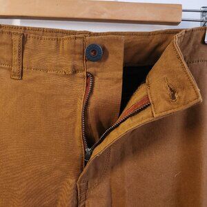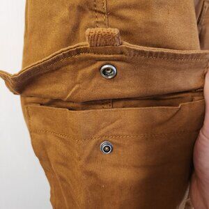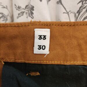 33'' waist, 30'' inseam, elastic ankle, back pockets with button, side pockets with button, zipper with button front, never worn