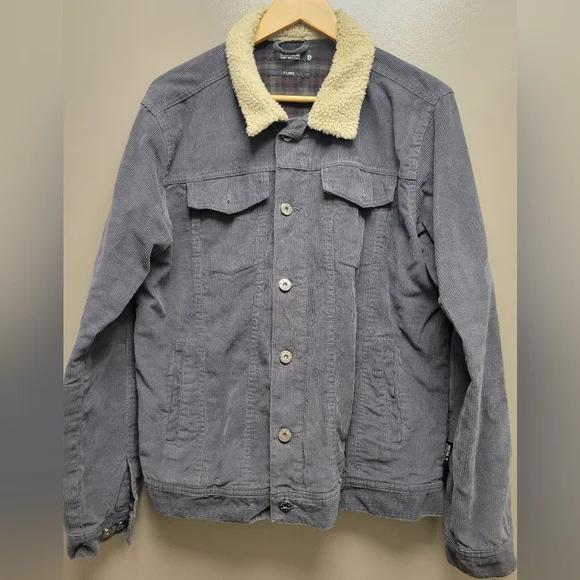 Men's corduroy sherpa lined button up western jacket. Like new, never worn. Grey/blue color.