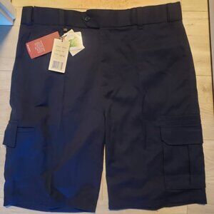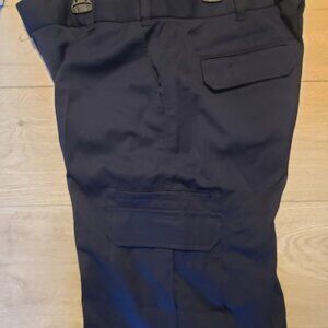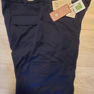 Flat front with side pockets, 2 rear pockets, 1 side cargo pocket and 1 side welt pocket