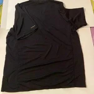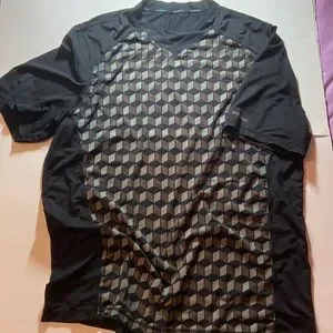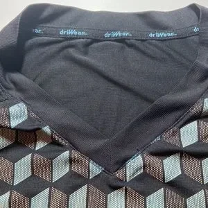 18” shoulder to shoulder, pit to pit 22” and length-30”. There are no tags in the garment so the measurements are posted in the pictures. The geometric pattern is super cool, one small pull on the back as shown. DriWear performance fabric to keep cool while looking cool. Slight v neck cut. B42