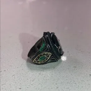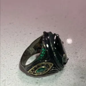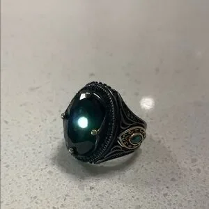 This sophisticated men's ring features an emerald stone, perfect for adding a touch of elegance to any outfit. The intricate design showcases timeless style. 925 silver. Originally purchased from an Etsy jewelry maker.