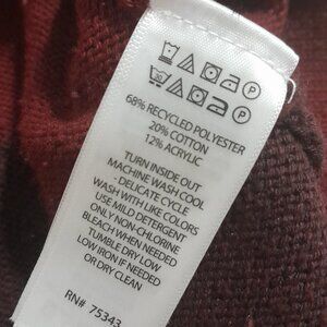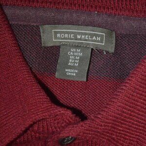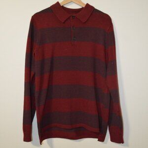 This Rorie Whelan long-sleeve knit sweater is a cozy and stylish staple for fall and winter. Features bold burgundy and dark maroon stripes, a soft textured knit, and a classic polo collar with button-up detail. Looks great layered or on its own for a casual-cool vibe.