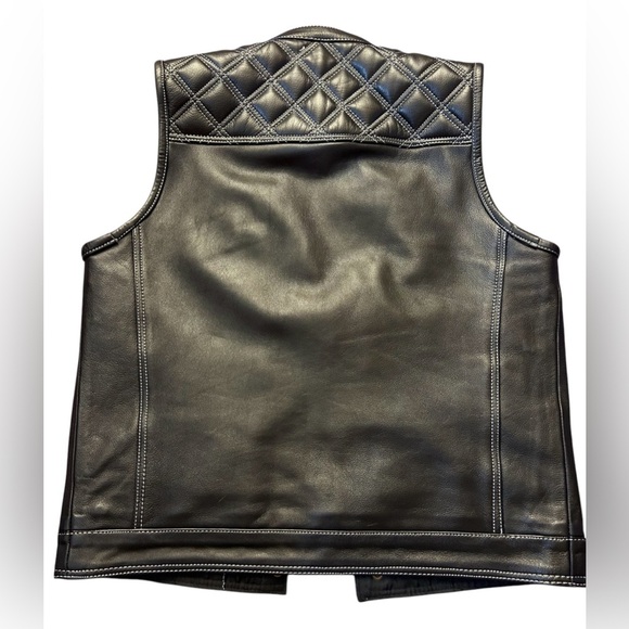 Men’s leather vest by Legend soft durable black leather size 46 this vest is in amazing condition the only flaw is where A patch was removed on front chest as seen in photos but an easy fix with a new patch to cover it up whit stitching accents make it very unique