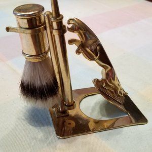 Unique brass (?) shaving stand with handle for sliding blades. Also has a shaving brush for foam that unscrews for replacing the brush (included). This is a very lovely piece for the man who has everything! The leaping jaguar can be removed for cleaning.