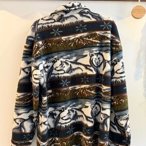Embrace the cold with this stylish wolf patterned shirt jacket. Featuring a blend of blue, brown, and white, it's perfect for adding a unique touch to your wardrobe.