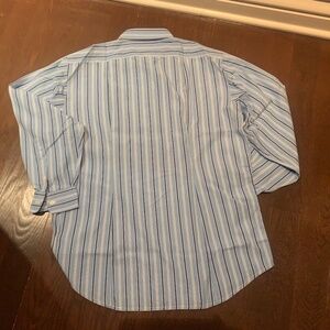 Very good condition men's woven yarn dyed striped shirt from high end French brand "Façonnable". Light Blue with dark blue/white stripes. 100% cotton, very high quality fabric as always with this brand. Made in France, which is rare these days. Excellent workmanship.