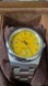 Men’s automatic stainless steel watch with sapphire glass, features a yellow dial and clear details