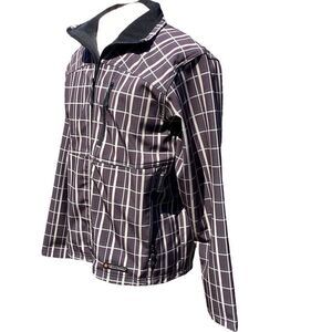 Black grey stipe “plaid”, polyester spandex, long sleeve, collar, full zipper, hem can be tightened, 3 front and side zippered pockets, EUC, neck to hem 28”, armpit to armpit 22”, armpit to cuff 22”.