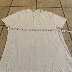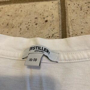 This is a simple and comfortable white t-shirt from the brand "DISTILLERY APPAREL." It is a size XL and has a classic crewneck style. The fabric is soft and perfect for casual wear. While it is in good condition, there are a few minor imperfections to be aware of. The small spot is light and may come out with a proper wash, but are noted for full transparency. This shirt is a great, affordable basic for everyday use.