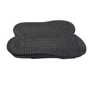 These black sandals feature a minimalist two-strap design with adjustable buckles for a secure fit. The contoured footbed offers anatomical shaping for enhanced comfort and arch support. The cork footbed adds a touch of casual style, making them perfect for everyday wear.