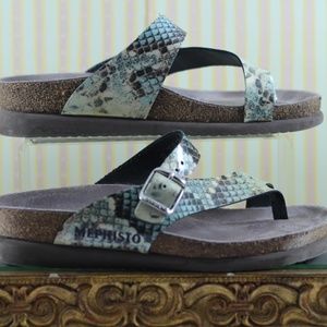 Mephisto Helen Sandal. Lovely green snakeskin pattern, silver hardware. Rubber soled, cork footbed. In good used condition - please see pics.