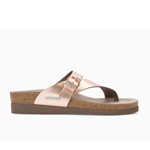 Asymmetric thong sandal with adjustable buckled strap featuring cork midsole and contoured footbed