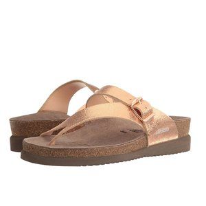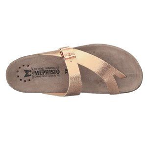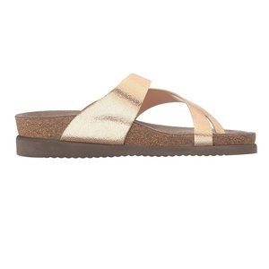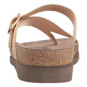 Asymmetric thong sandal with adjustable buckled strap featuring cork midsole and contoured footbed
