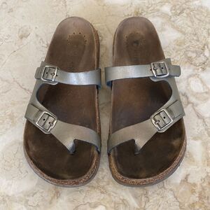 In good preowned condition Mephisto leather sandals in lovely dark silver, dual adjustable buckles, contoured footbed, super comfortable!