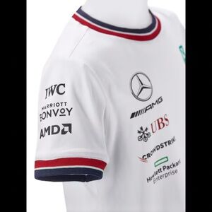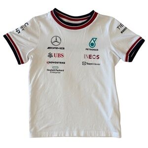 Official driver T-shirt from the 2022 Formula 1 season, made for young racing fans. This white, regular-fit tee features half sleeves, a striped side band, and authentic printed logos including the Mercedes-Benz emblem and various team sponsors.