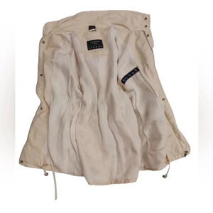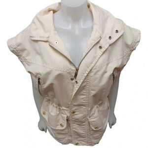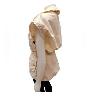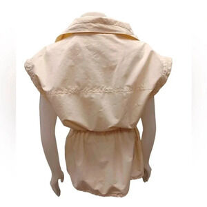 Off white, ivory in color, this garmet is sleeveless and features plenty of pockets. Six of them on the outside and one inside pocket. Adjustable drawstring waist and adjustable drawstring bottom for warmth and comfort. This garmet has a zipper and snap closure. The collar can be snapped closed to form turtle neck or layed flat.