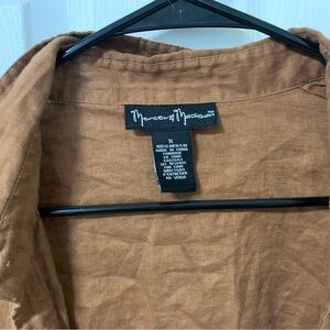 Stylish tan button-up shirt. Features a classic collar and front pockets.