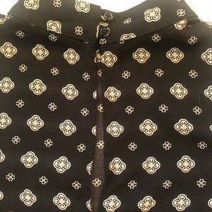 Flowy, patterned top. Black, cream and tan. High neck, with button closure above opening at the back. Sleeveless. Excellent pre-owned condition, no visible marks or flaws.