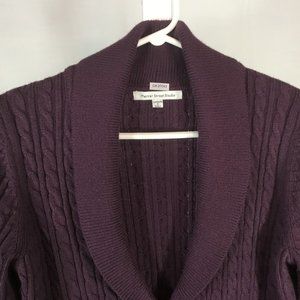 Cableknit cardigan with shawl collar and button front. Long sleeves.