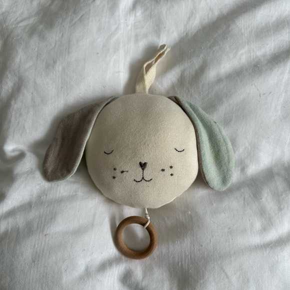 Plays a lullaby when you pull the chord. Has a Velcro attacher so you can put it on crib or stroller. Working and looks new.