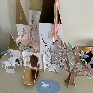 EUC from a SFPF home, in original box. Used once for my daughter's princess themed birthday party and ready for the next little princess. Lots of compliments on centerpiece, which includes the castle, drawbridge, princesses, a knight, dragon, unicorn, tree, pond with swan. Beautifully made, classic Meri Meri !