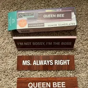 Set of three humor nameplates with fun phrases. Perfect for office decor.