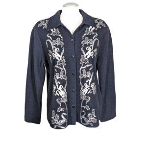 This elegant black jacket is a perfect addition to your wardrobe. Made of high-quality Merino wool, it ensures your comfort during the cold winter and fall seasons. The jacket features a beautiful floral pattern with embroidered accents and sequin details, making it suitable for various occasions such as travel, party/cocktail, casual, and workwear. The mid-length jacket has a classic fit and long sleeves with a button closure. It is a size L and is suitable for regular-sized women. The Jones New York Collection has designed this shacket, which is a perfect blend of style and warmth.