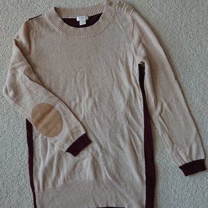 J. Crew merino wool sweater with suede style elbow patches, buttons on left shoulder, contrasting cuffs and back, and 3/4 length sleeves. Sweater shows very light wear in the form of some minor pilling.