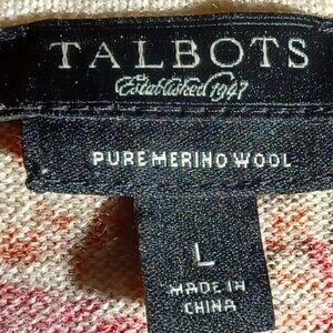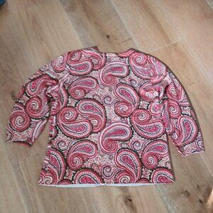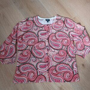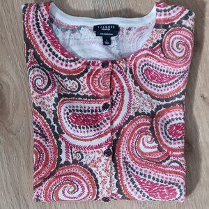 Talbots 3/4 sleeve soft merino wool sweater. Very comfortable button up camisole/jersey. Wear solo or open over a top. Pattern is printed not woven. Colours are pink, red, rust brown and cream. In very good condition.