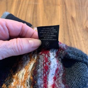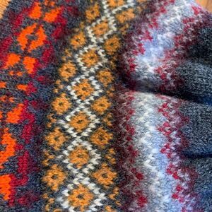 Merkley 100% wool beanie style hat for small head or kids. Nordic or Fair Isle pattern in multi colours. Excellent used condition with some irregularity only in pompom (see photo). Cotton head band for comfort. Slate grey background, multi coloured pattern. Warm winter wear from Lemon Squeezy Shop🍋
