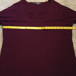 Very good preowned condition, beautiful purplish red, wine coloured, v-neck, faux cross tie knit sweater top by Addition Elle Petite. Nice stretch and a beautiful overall piece made from a rayon blend of threads. A wardrobe classic.