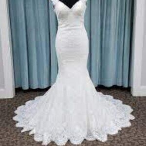 Sample Bridal Gown, Allure Bridals Madison James Wedding Dress, Bridal size 6 IVORY LATTE More pics will follow New with tags (Bridal fits really small, so a bridal size 6 fits more like a size 0 or 2 in normal clothes, thats why I have it listd as size 2, see measures and details below about alterations) I LOVE the lightness of this show-stopping once-in-a-lifetime gown! The lace is gorgeous, the fit is spectacular, and the back is AMAZING, the train is STUNNING! . This gown is a shop sample & has been tried on (but never worn or left the store). It is in excellent condition, with no marks or tears. It may benefit from a light cleaning/steam just to freshen it up from being tried, but nothing photo-grapheable or worthy of note. It may be missing designer tags but has shop tags and all appointed accompaniments (if it came with beads or straps...) Bridal size chart Approximately 34.5 inch bust 26.5 inch waist 37.5 inch hip LONG The slightly darker underlay really makese the lace pop! Please keep in mind that ALL designer bridal gowns require altering for fit; as they are made for very tall, very large-breasted women, and it's the alterations that give that million-dollar fit! Most people require a hem (as the gowns usually accommodate 5 foot 8 bodies or taller), and usually adjustments around the bust & straps & sleeves (if applicable), & a bustle. This gown can easily be taken in about 2 sizes (made smaller) by a professional seamstress, & let out a bit as well.