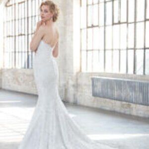 Please keep in mind that ALL designer bridal gowns require altering for fit; as they are made for very tall, very large-breasted women, and it's the alterations that give that million-dollar fit! Most people require a hem (as the gowns usually accommodate 5 foot 8 bodies or taller), and usually adjustments around the bust & straps & sleeves (if applicable), & a bustle. This gown can easily be taken in about 2 sizes (made smaller) by a professional seamstress, & let out a bit as well.