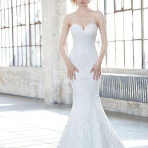 This gown is a shop sample & has been tried on (but never worn or left the store). It is in excellent condition, with no marks or tears. It may benefit from a light cleaning/steam just to freshen it up from being tried, but nothing photo-grapheable or worthy of note. It may be missing designer tags but has shop tags and all appointed accompaniments (if it came with beads or straps...)