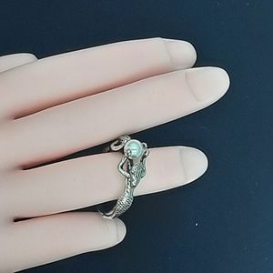 Encircle your finger with two lovely Mermaids presenting a pearl. Silver plate size 8.5