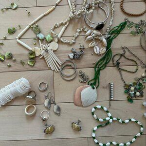 Curated jewelry bundle inspired by mermaidcore and natural coastal tones. Includes a mix of shell necklaces, green glass accents, silver bangles, and earthy statement pieces. Perfect for layering or creative styling.