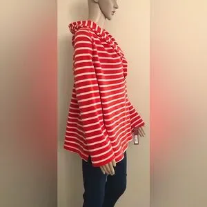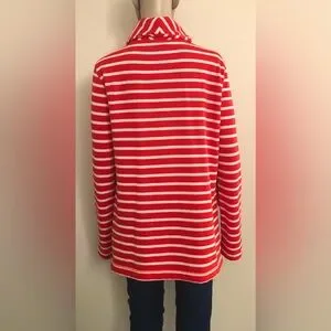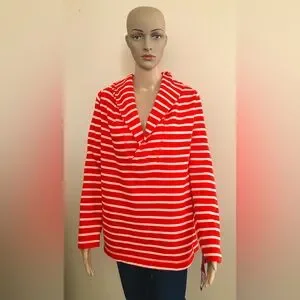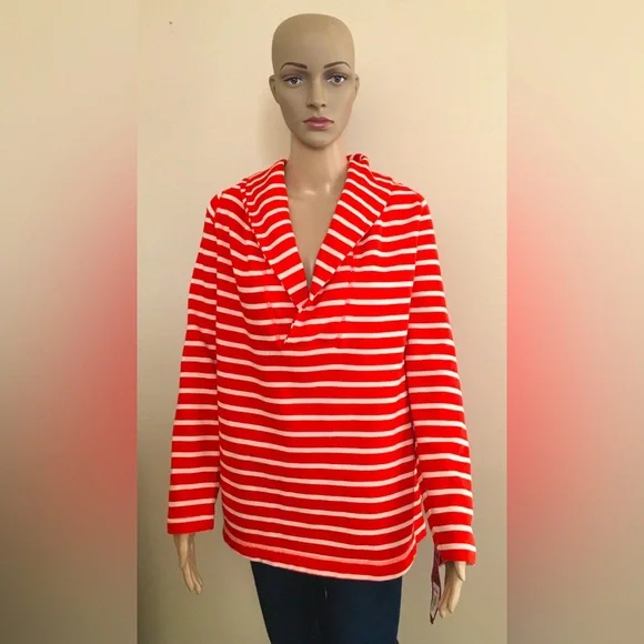 Orange & White Knit Collared VNeck Sweater. Side Slits. Topstitch at neck, shoulder, hem and cuff.