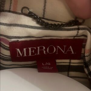 Step out in style with the Merona trench coat, featuring a sophisticated cream and black plaid pattern. This classic trench coat is perfect for transitional weather, its lightweight fabric ensures comfort and elegance. Size large, 52 cm pit to pit, 107 cm length