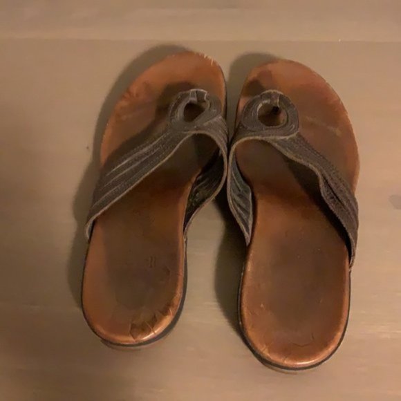 VGUC Merrell chocolate brown leather thong sandals with rubber soles in women’s size 7 1/2.
