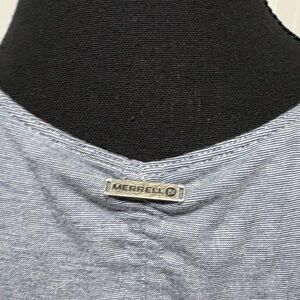 This casual gray sundress by Merrell features a sleeveless design with a scoop neckline, perfect for warm weather outings. Its midi length and relaxed fit offer a comfortable and stylish look, making it an ideal choice for everyday wear. The simple, clean lines and versatile gray blue color make it a wardrobe staple for any casual occasion.