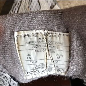 Merrell Mesa Ventilator II hiking shoe 7.5 Grey/taupe shades. Very good used condition, some minor colour change from normal wear. Interior construction is still solid as seen in photos. Nylon uppers with leather trim. They are, as the name implies, well-ventilated. Sturdy soles, lightweight, good traction.