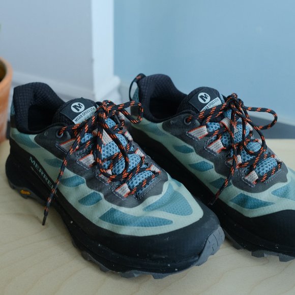 Super sick Goretex/waterproof hiking boots/trailrun sneakers hybrid from Merrell, in almost perfect condition. They're rugged yet lightweight and very comfortable, can be easily styled casually as well. I love the colourway with the red laces. Sadly they don't fit my foot very well, so only worn a few of times.