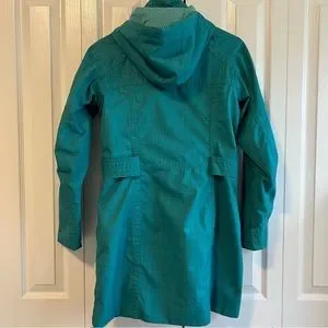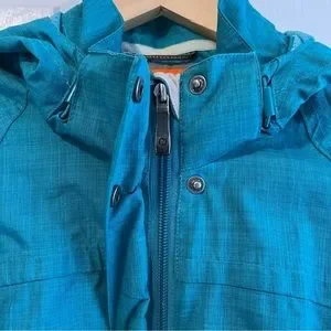 Waterproof - hooded (removable) - adjustable straps wrist - inside drawstring to tighten the waist - zipped inside pocket - snap outside pockets - breathable mesh inside hood and interior back.