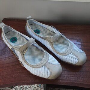 Stylish Merrell shoes with breathable mesh. Tan accents for a modern look.