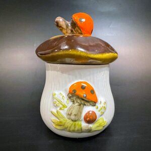 Cute Merry Mushroom creamer and sugar bowl with lid by Sears Roebuck. Made in 1976, these pieces have the nostalgic orange and brown mushroom design.