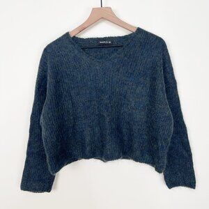 Embrace cozy French girl style with this Mes Soeurs Et Moi rounded V-neck jumper, crafted from a luxurious, fuzzy blend of kid mohair and merino wool. Its oversized, slightly cropped fit and rich dark green blue teal color make it an effortlessly chic and warm statement piece. This is a timeless wardrobe staple perfect for adding texture and flair to your everyday look.