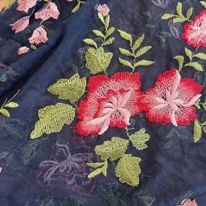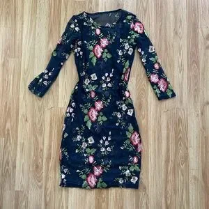 Elegant navy dress with vibrant floral patterns. Perfect for any occasion.
