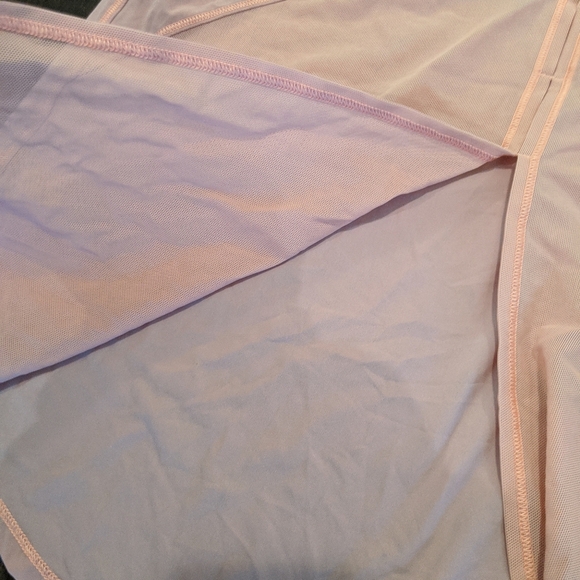 Light pink workout tank with mesh paneling and small mesh split in the back.